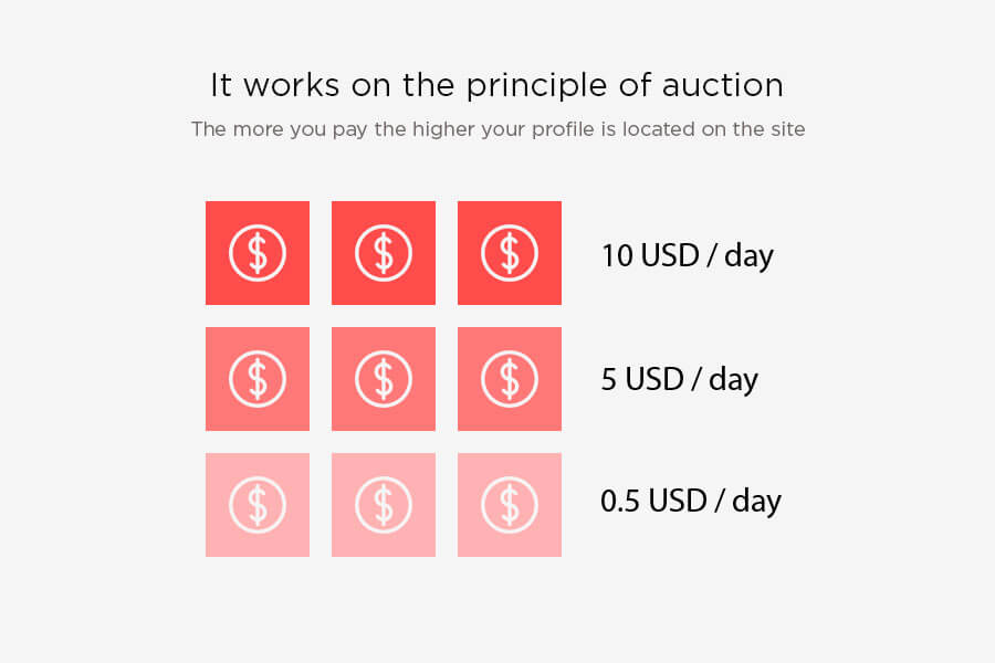 Paid placement starts from 0.5 USD per day. Profiles with higher bids appear higher in the catalog according to the auction principle.